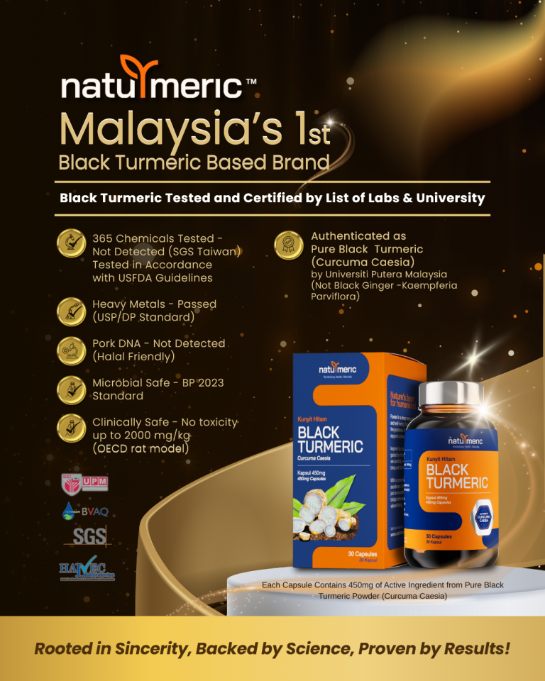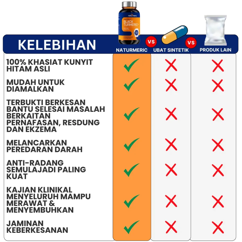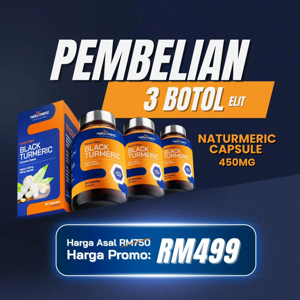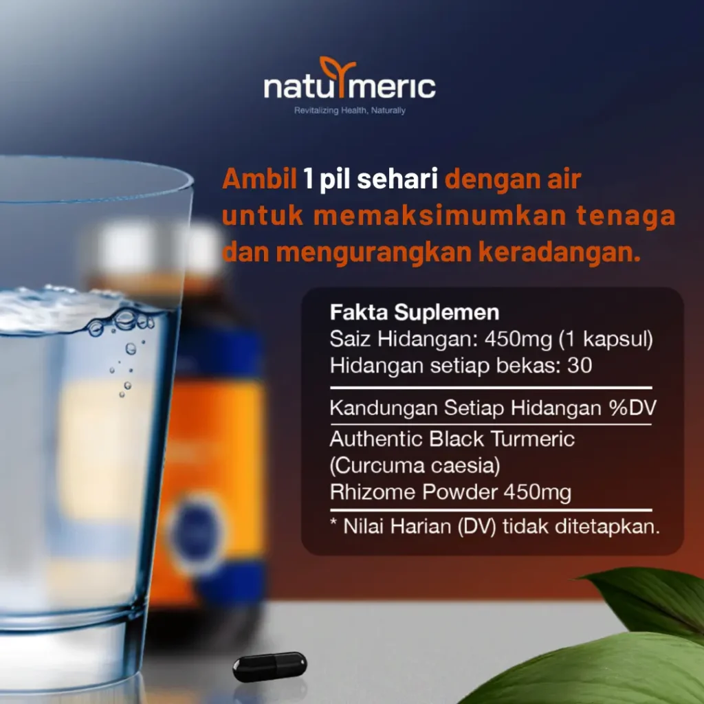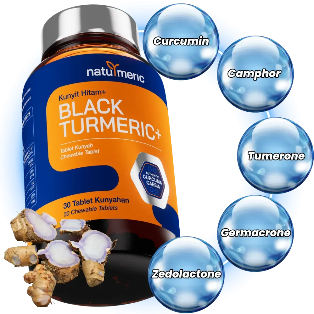 Black Turmeric dalam NATURMERIC mengandungi lebih kurang 10x lebih banyak curcuminoid berbanding kunyit biasa, menjadikannya lebih berkesan untuk melawan keradangan, sakit sendi, dan menurunkan asid urik.